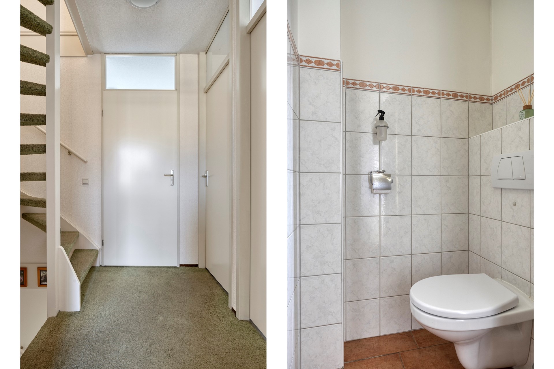 Entree, hal met meterkast, toiletruimte en trapopgang. Vanuit de hal toegang tot de keuken en de woonkamer.