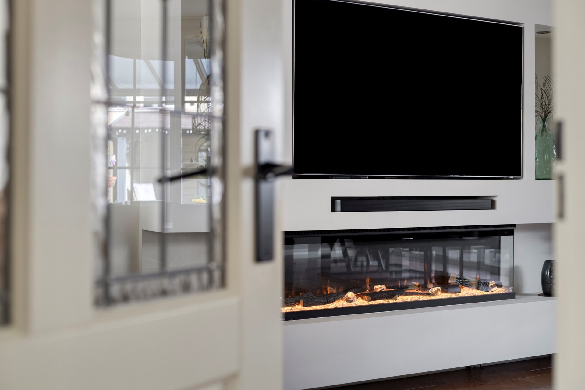 In de woonkamer bevindt zich een ‘Cinewall’ met open haard en tv-meubel.