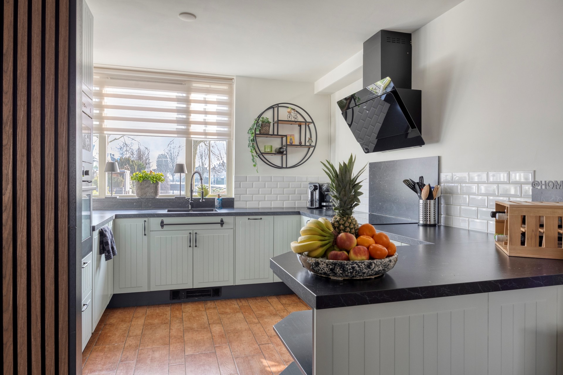 Dankzij de vele raampartijen is het een lichte en sfeervolle leefruimte.
