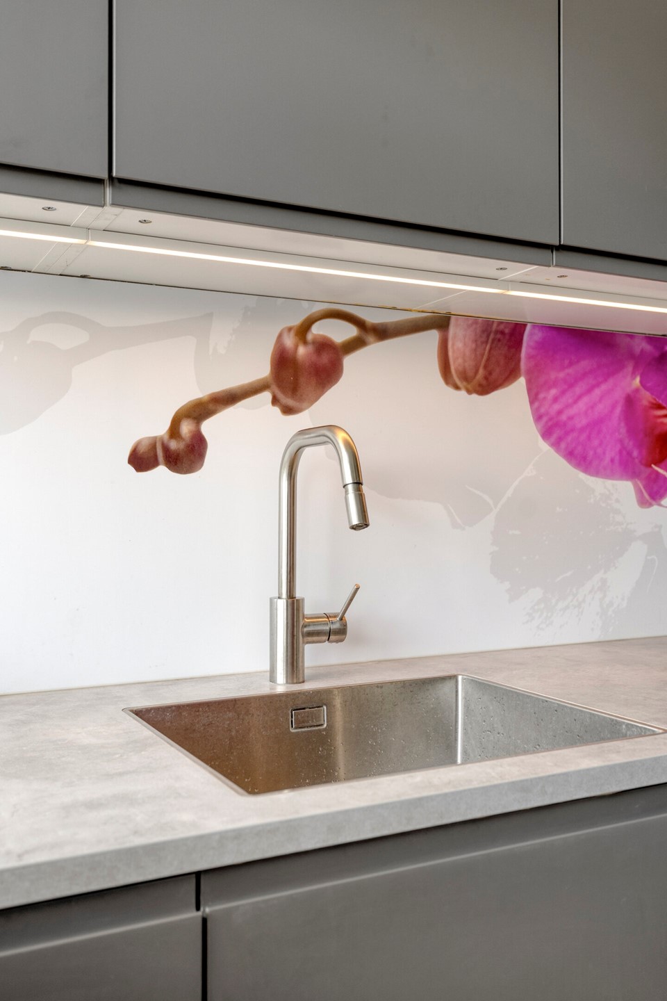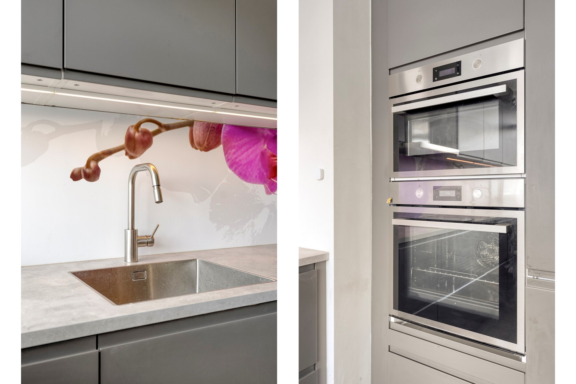 Aan de voorzijde de dichte keuken, voorzien van o.a. inductie-kookplaat, afzuigkap, oven, magnetron en vaatwasser.